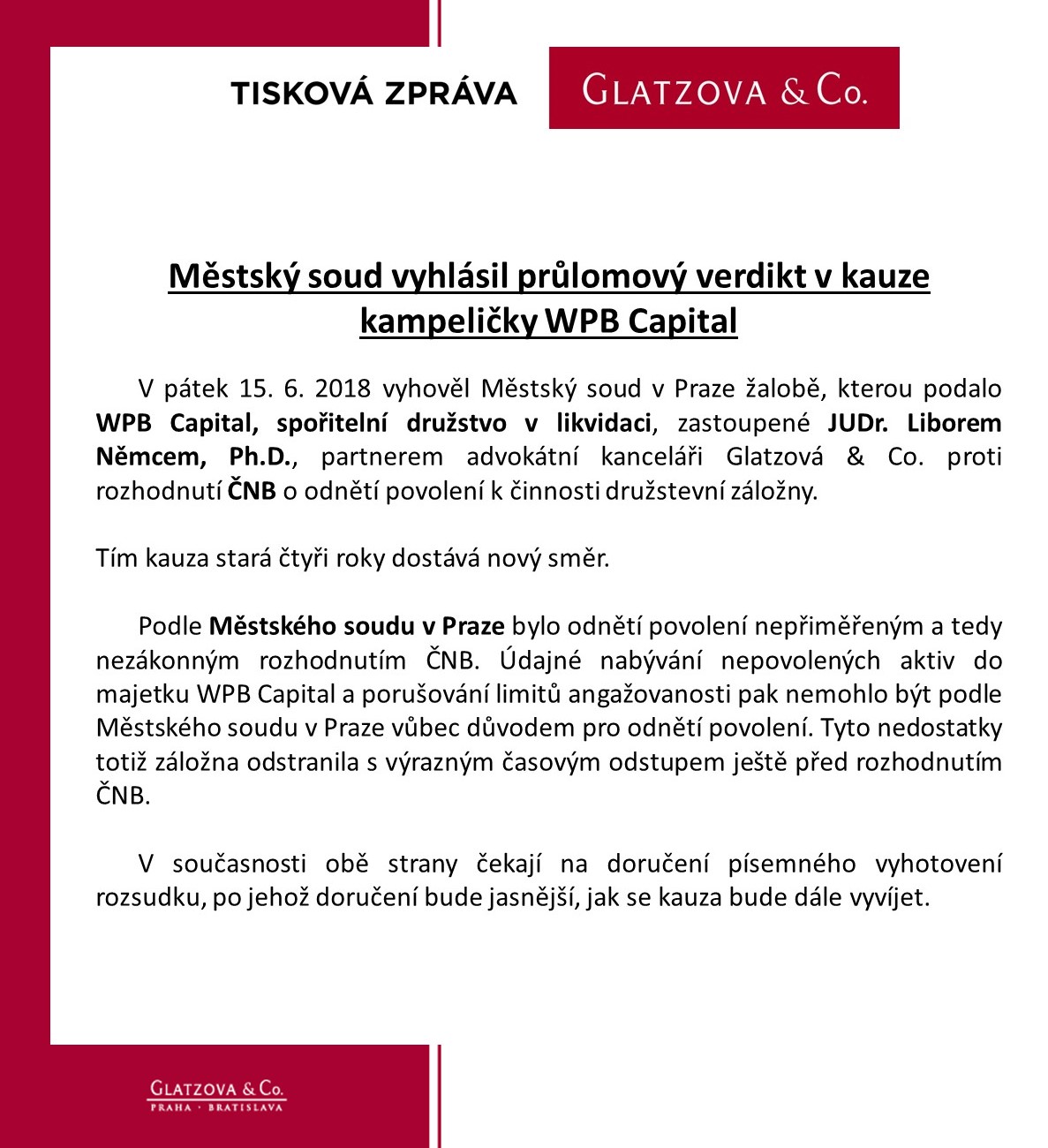 V pátek 15. 6. 2018 vyhověl Městský soud v Praze žalobě, kterou podalo WPB Capital, spořitelní družstvo v likvidaci, zastoupené JUDr. Liborem Němcem, Ph.D., partnerem advokátní kanceláři Glatzová & Co. proti rozhodnutí ČNB o odnětí povolení k činnosti družstevní záložny. Tím kauza stará čtyři roky dostává nový směr. Podle Městského soudu v Praze bylo odnětí povolení nepřiměřeným a tedy nezákonným rozhodnutím ČNB. Údajné nabývání nepovolených aktiv do majetku WPB Capital a porušování limitů angažovanosti pak nemohlo být podle Městského soudu v Praze vůbec důvodem pro odnětí povolení. Tyto nedostatky totiž záložna odstranila s výrazným časovým odstupem ještě před rozhodnutím ČNB. V současnosti obě strany čekají na doručení písemného vyhotovení rozsudku, po jehož doručení bude jasnější, jak se kauza bude dále vyvíjet.