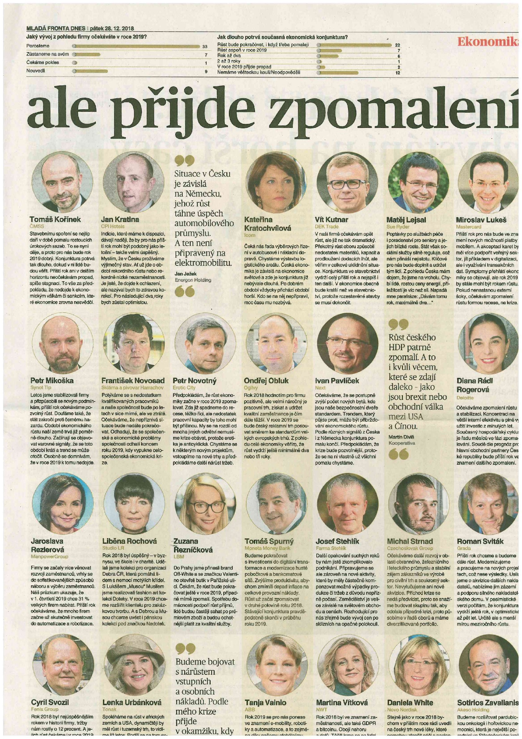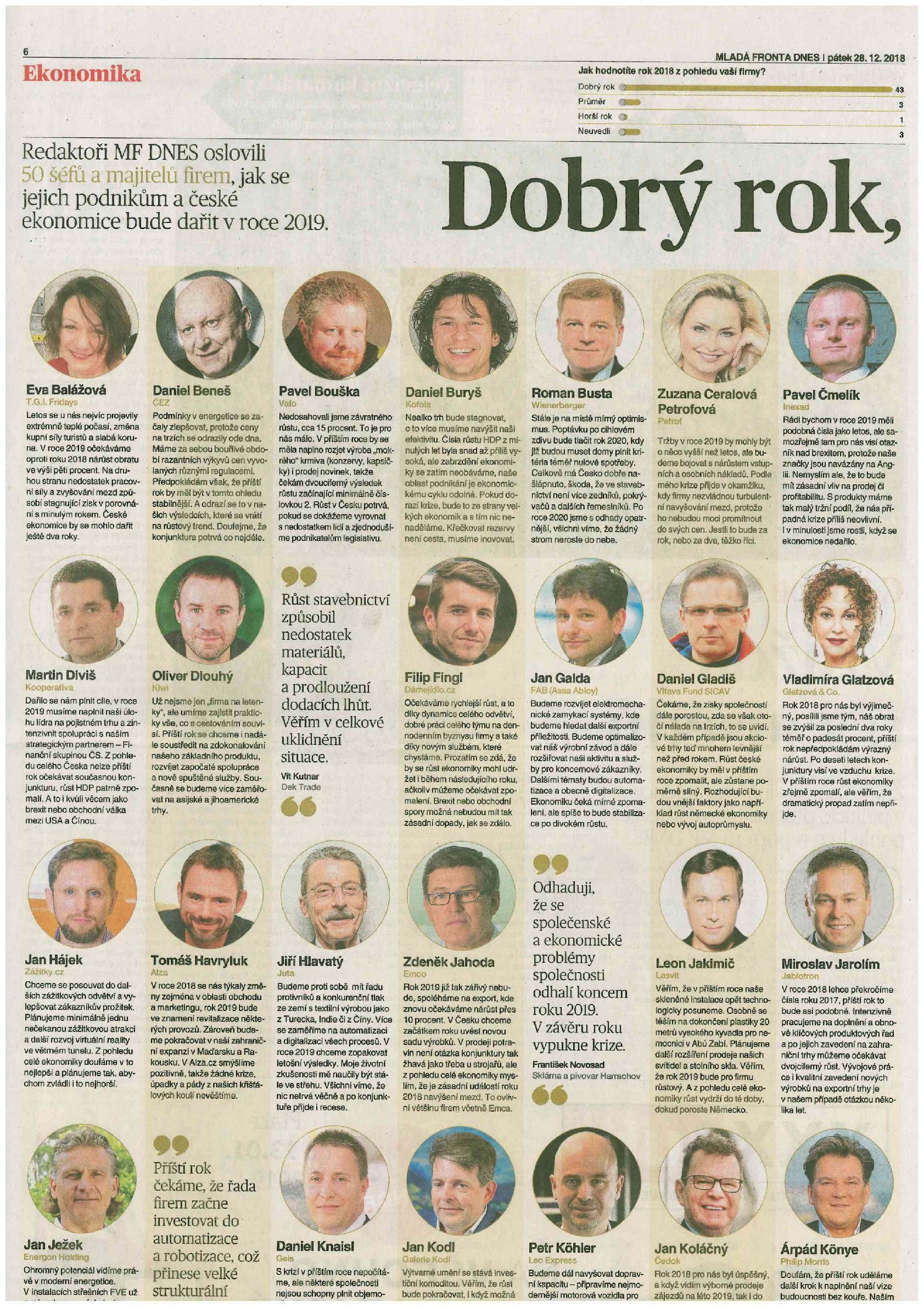 JUDr. Vladimíra Glatzová pro MF DNES: Redaktoři MF DNES oslovili 50 šéfů a majitelů firem, jak se jejich podnikům a české ekonomice bude dařit v roce 2019.