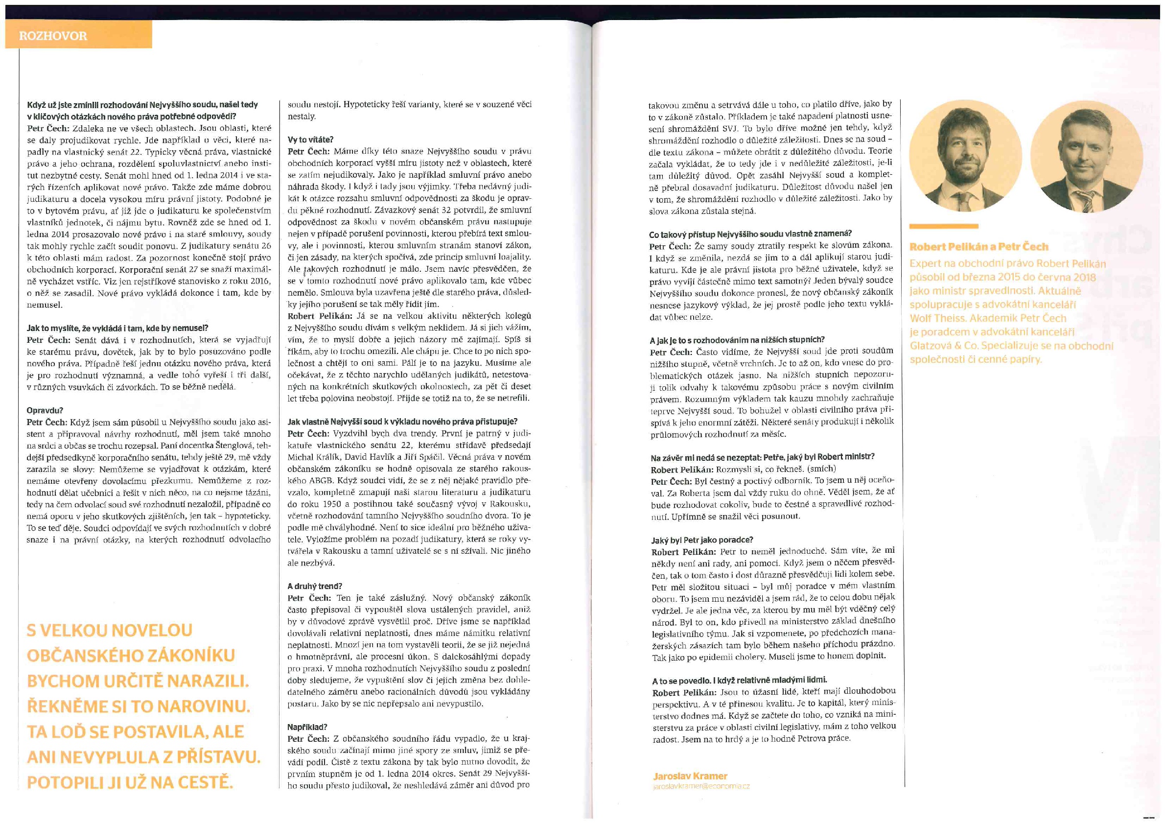 JUDr. Petr Čech, Ph.D., LL.M. pro Právního rádce. Robert Pelikán a Petr Čech patřili před pěti lety k největším kritikům nového soukromého práva. Občanský zákoník jim vadí dodnes. Přesto nenašli sílu k jeho novelizaci. Experti na obchodní právo Petr Čech a Robert Pelikán patřili před pěti lety k největším kritikům nového občanského zákoníku. Obsahuje podle nich řadu chyb, které je třeba opravit. Nedlouho poté, co kodex začal po více než patnácti letech příprav konečně platit, se oba dostali na ministerstvo spravedlnosti. Pelikán nejprve jako náměstek ministryně Heleny Válkové a později i jako ministr, Petr jako jeho poradce. Přesto se jim zásadní změny v kodexu prosadit nepodařilo.