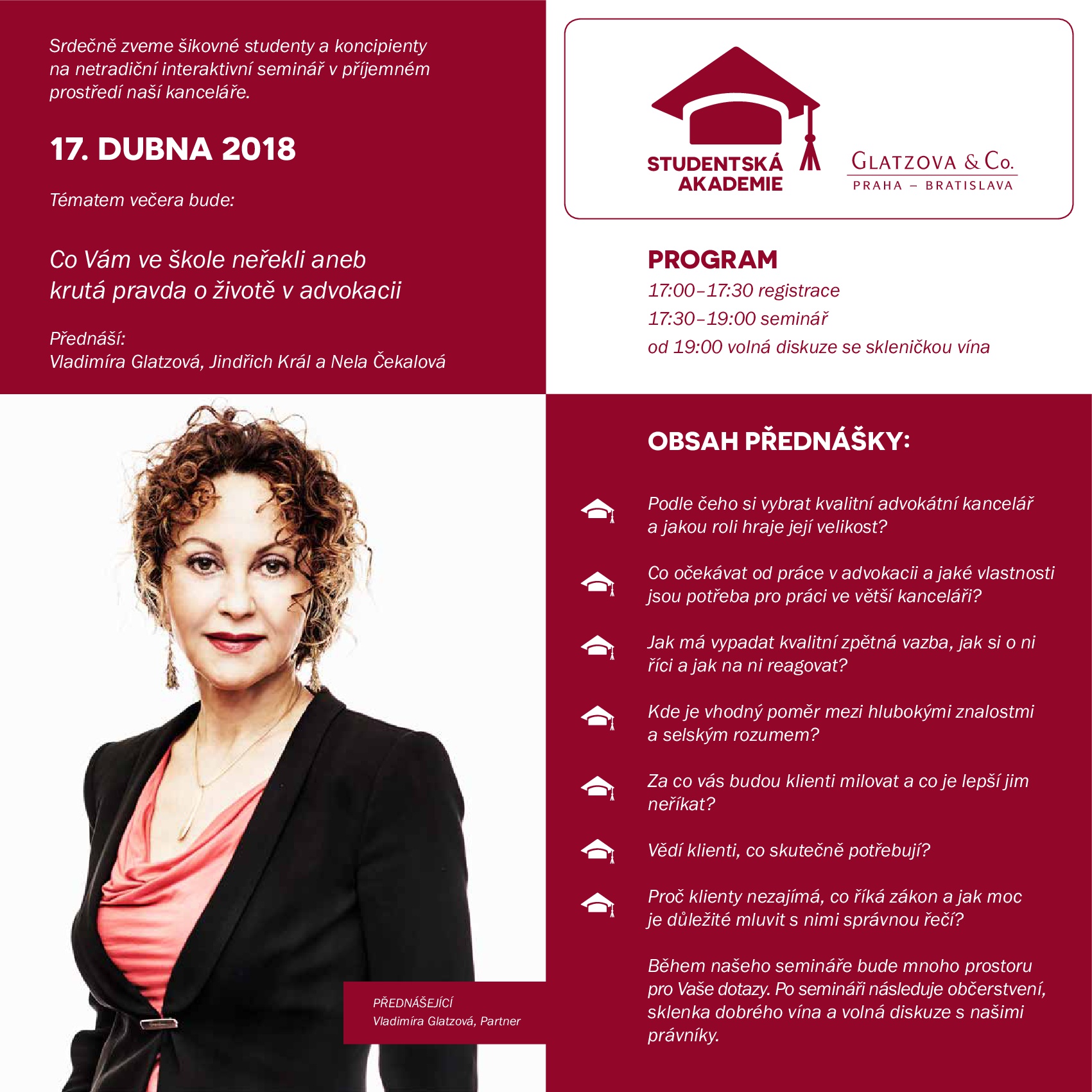 Vzhledem k omezené kapacitě reprezentačních prostor je nutná registrace předem. Můžete pro ni využít registrační formulář nebo email akademie@glatzova.com. Do poznámky prosím uveďte kdy a na jaké fakultě jste zahájili studium.